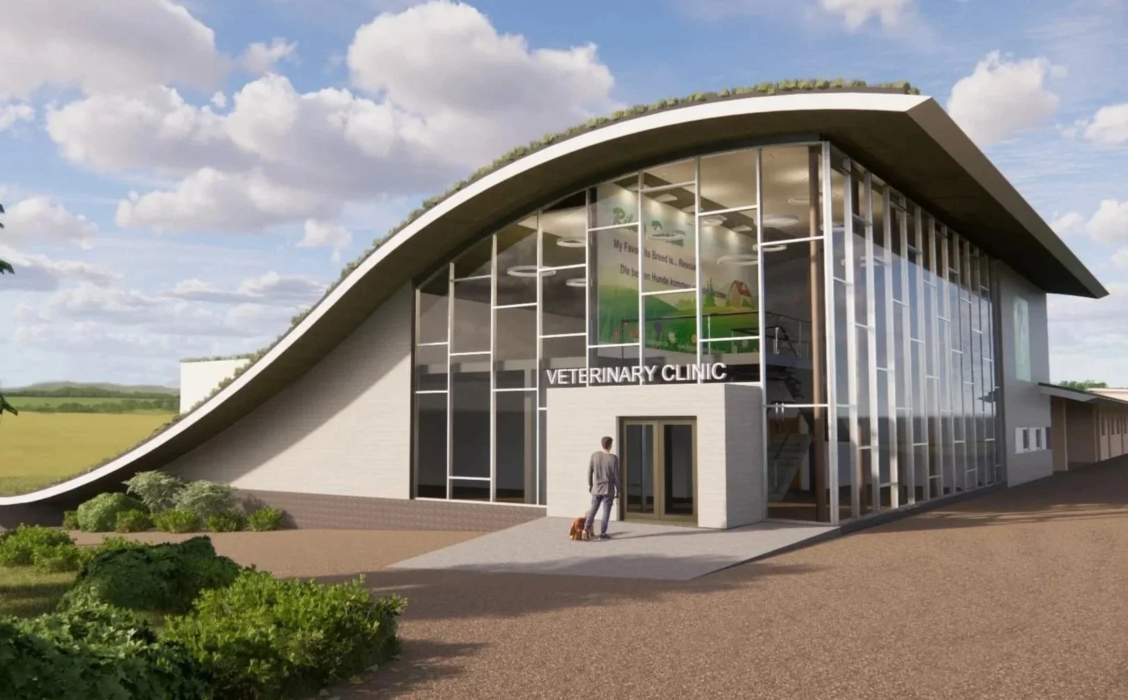 The new colour scheme for the 8,000m2 Veterinary Hospital and Dog Rescue and Adoption Centre has been approved. This facility will include a reception and office building, kennelling for 256 dogs, a veterinary hospital, training arenas, a dog boarding block, accommodation building and other ancillary buildings.