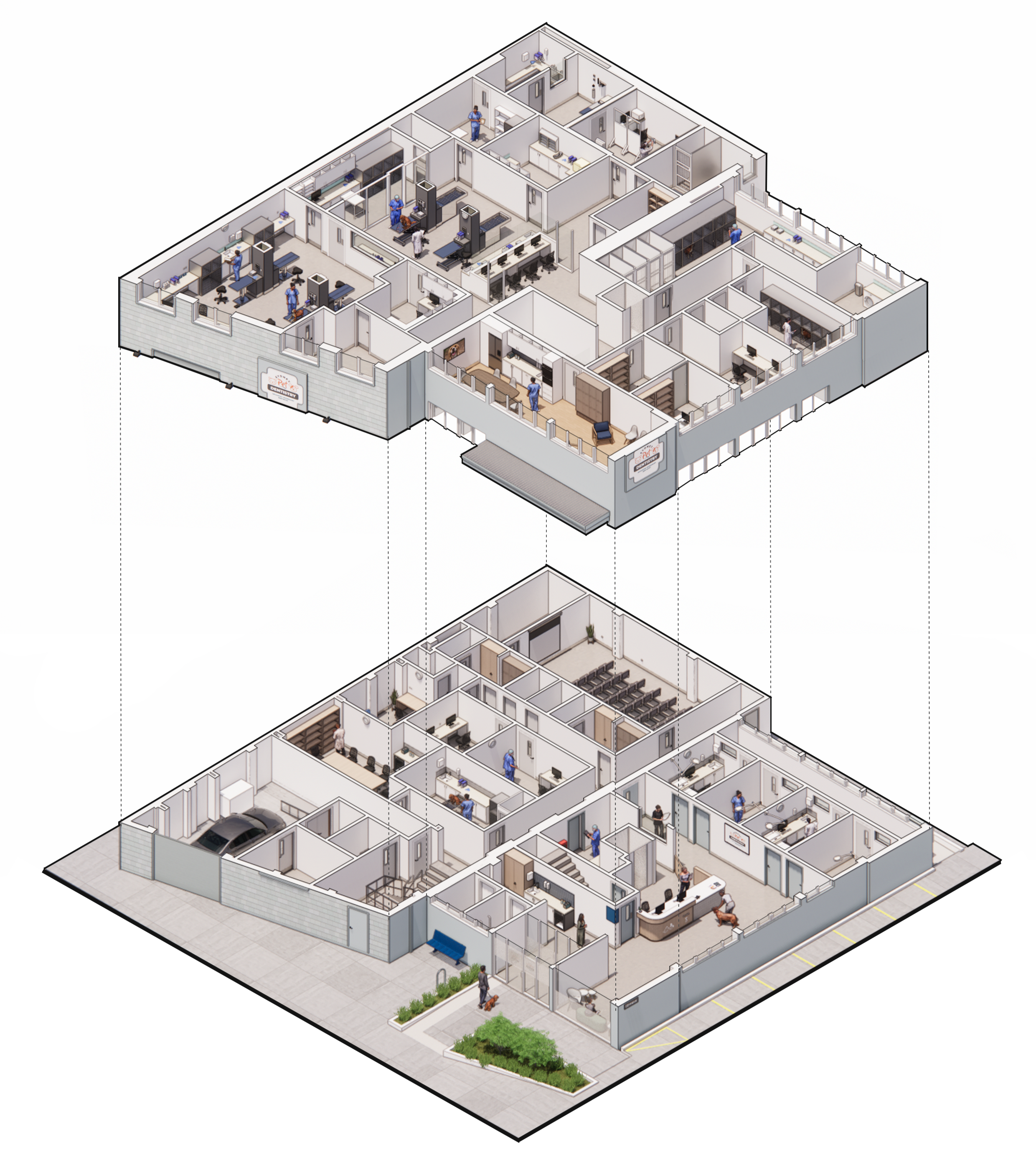 The focal point of the clinical area is a large treatment room, around which other clinic rooms (dental theatre, isolation, pre-op, sterilisation room, pharmacy, workstation, etc.) are distributed. The addition of glazing partitions creates the sensation of one large open space, facilitating collaboration and supervision from anywhere in the clinic area.